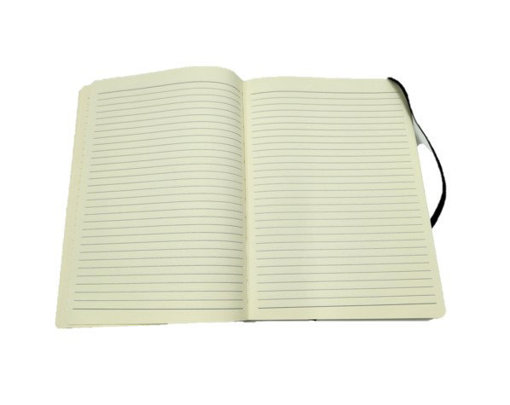 Large 80 page note book with a built in elastic closure, ribbon marker and expandable accordion pocket on the inside back cover